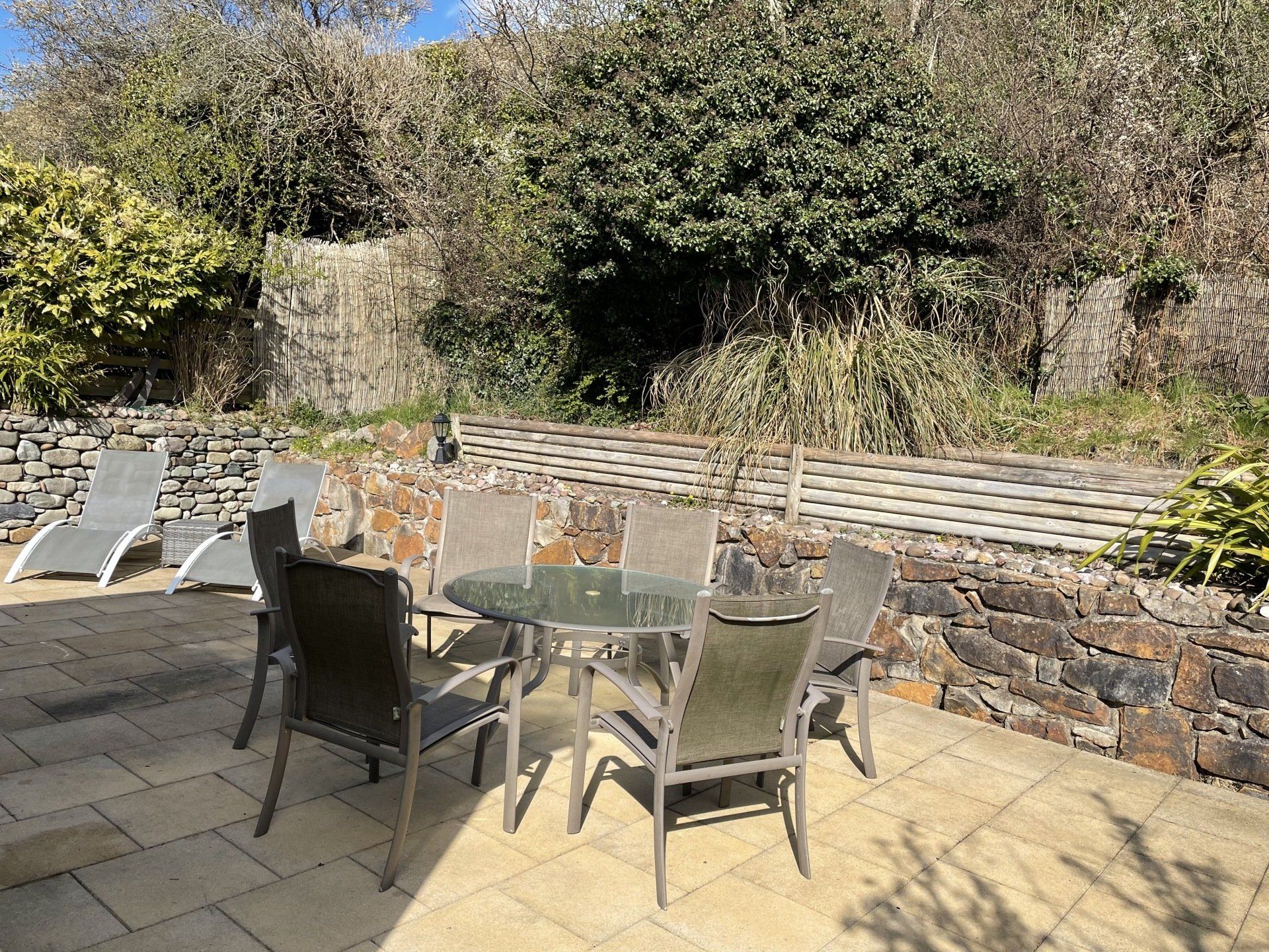Outside Patio large flagged patio which is private and fully enclosed, a range of patio furniture including loungers, table and chairs and stools