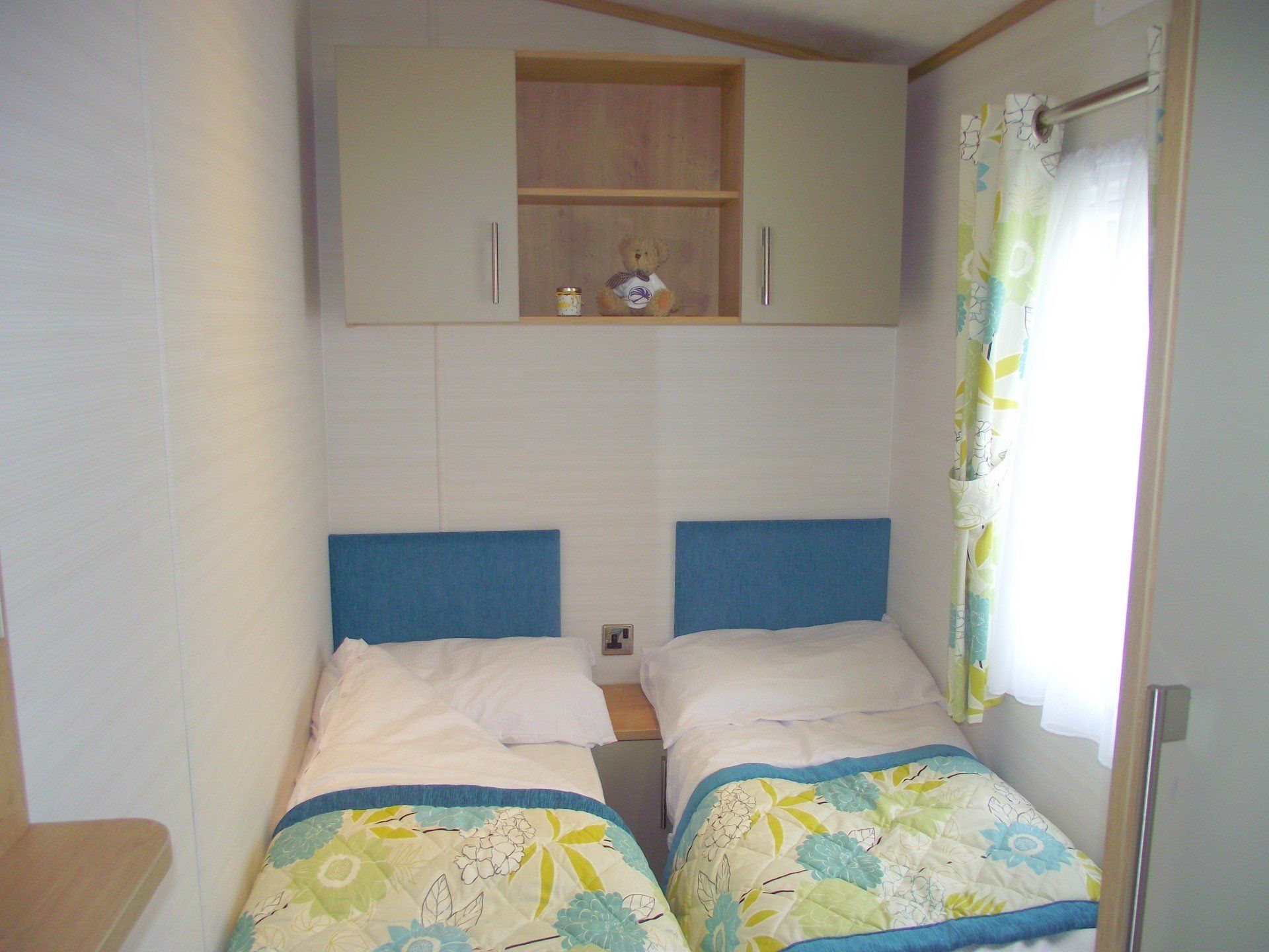 Bedroom 3 2 x small single beds with bedside cabinet in between and wall mounted cupboards and shelf over, single wardrobe.