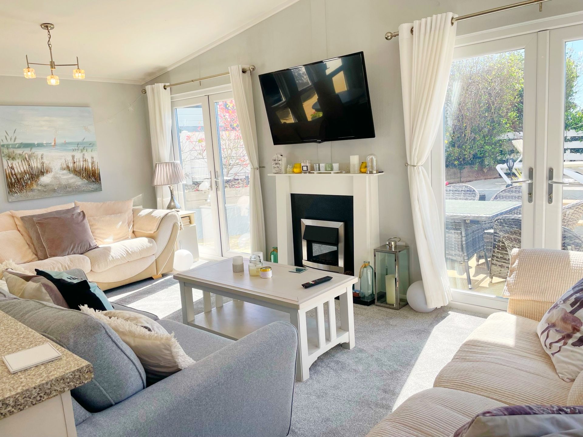 Lounge with modern comfortable seating consisting of three 2/3-seater sofas, one being a sofa bed, wall mounted flat screen smart TV, electric fire, 2 sets of double doors leading onto the patio