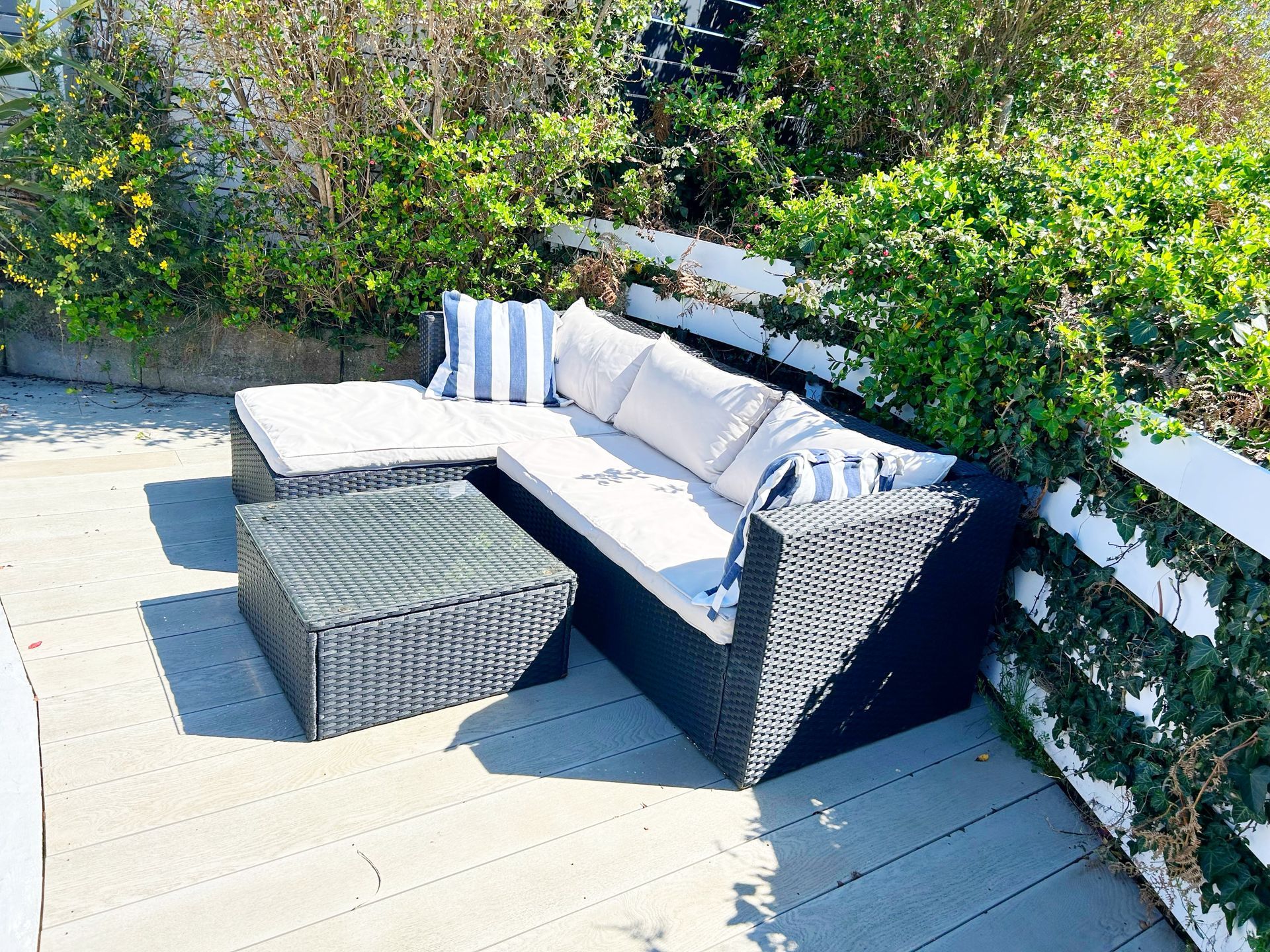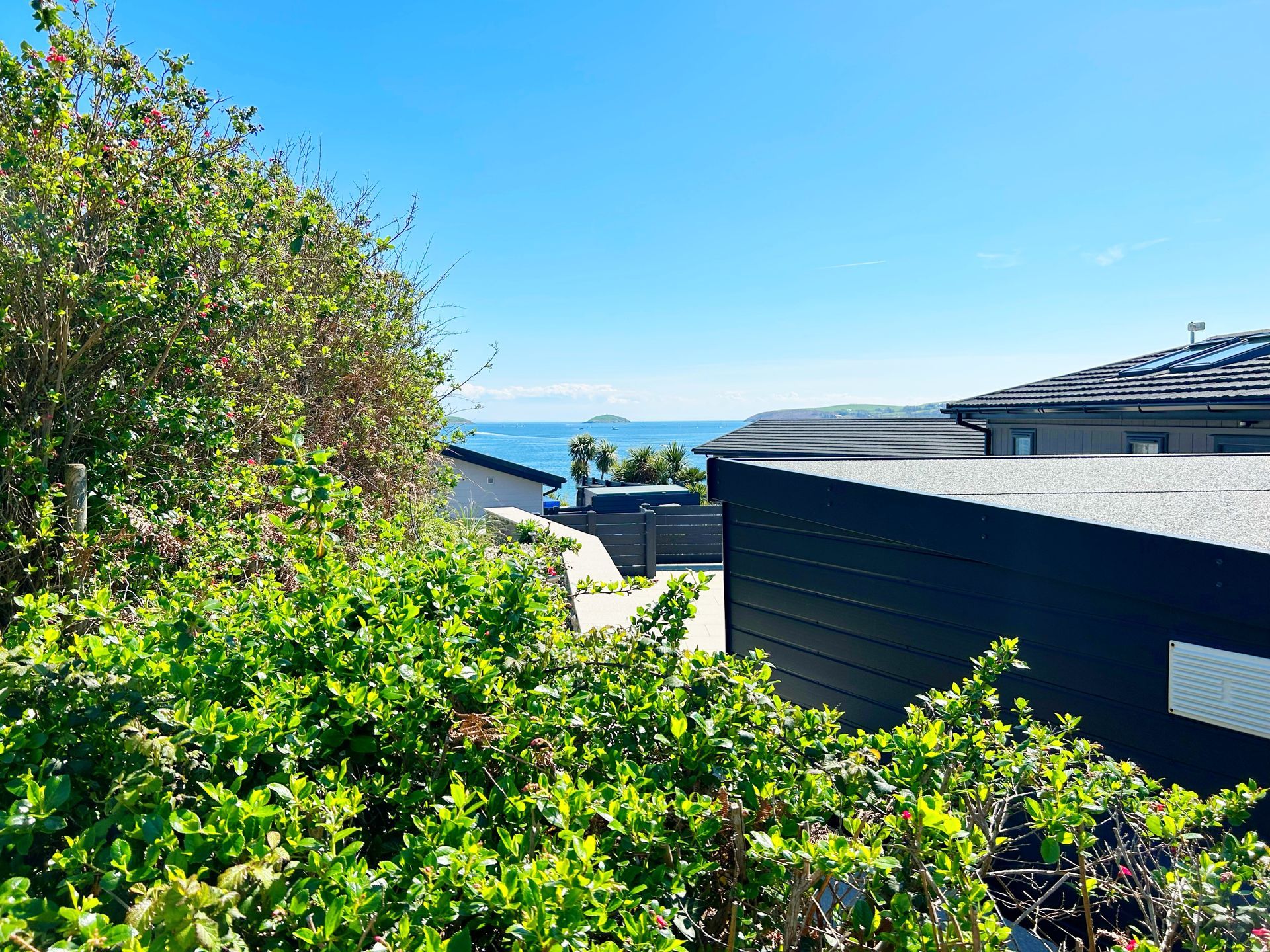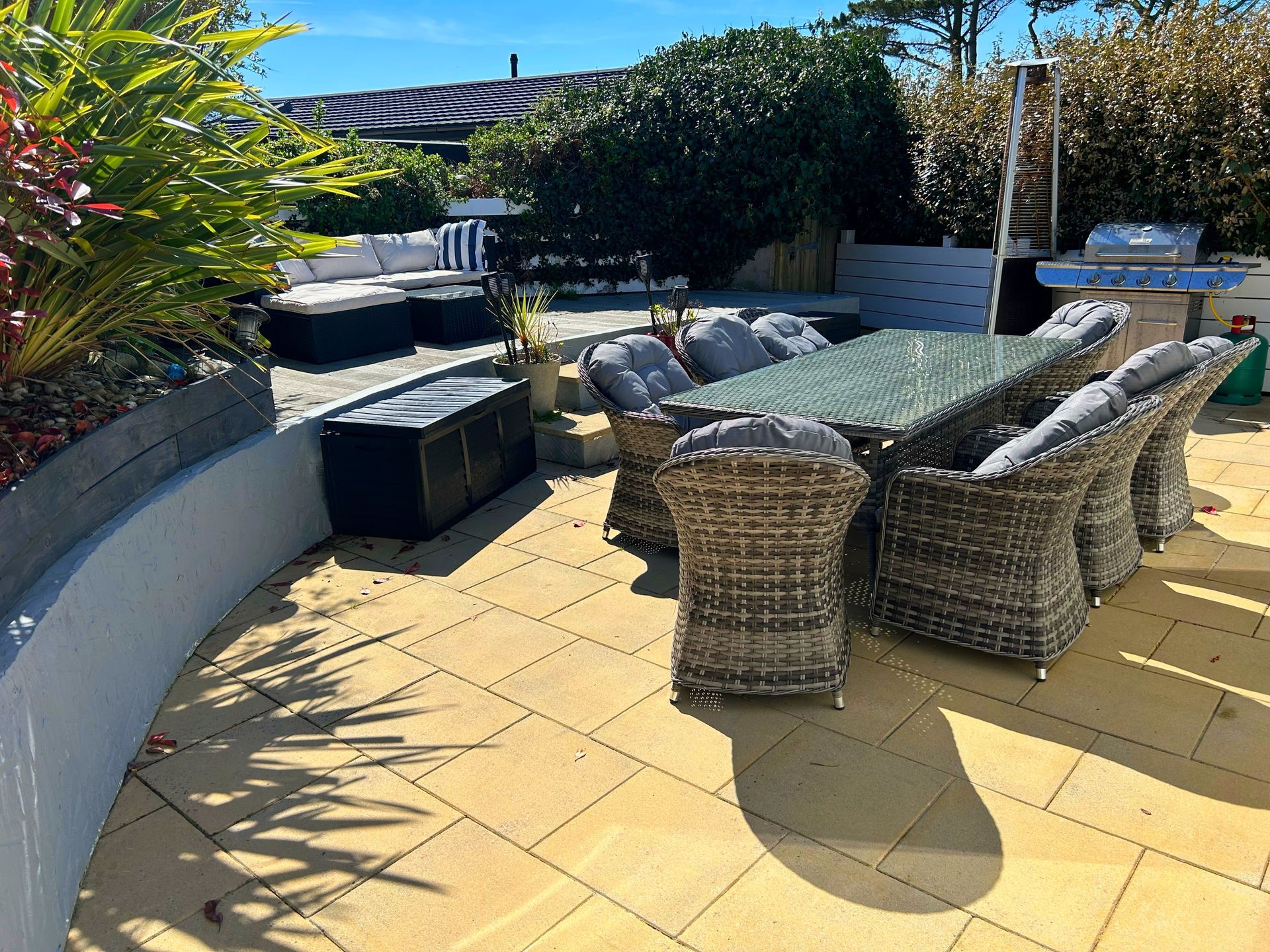 Patio area large paved patio area to the side and front of the chalet, plus a raised decked area with sea views